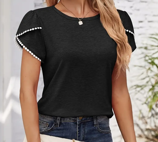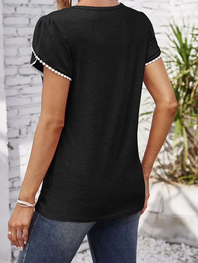 Black top with tulip sleeves and white lace trim on the edges. Slim fit with crew neckline.
