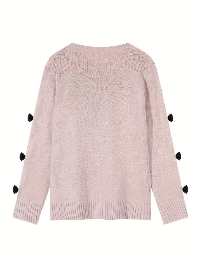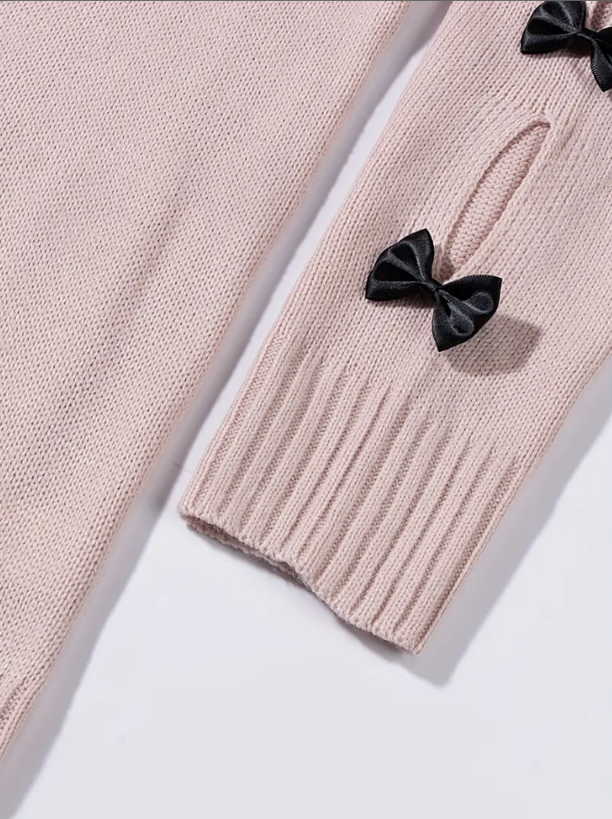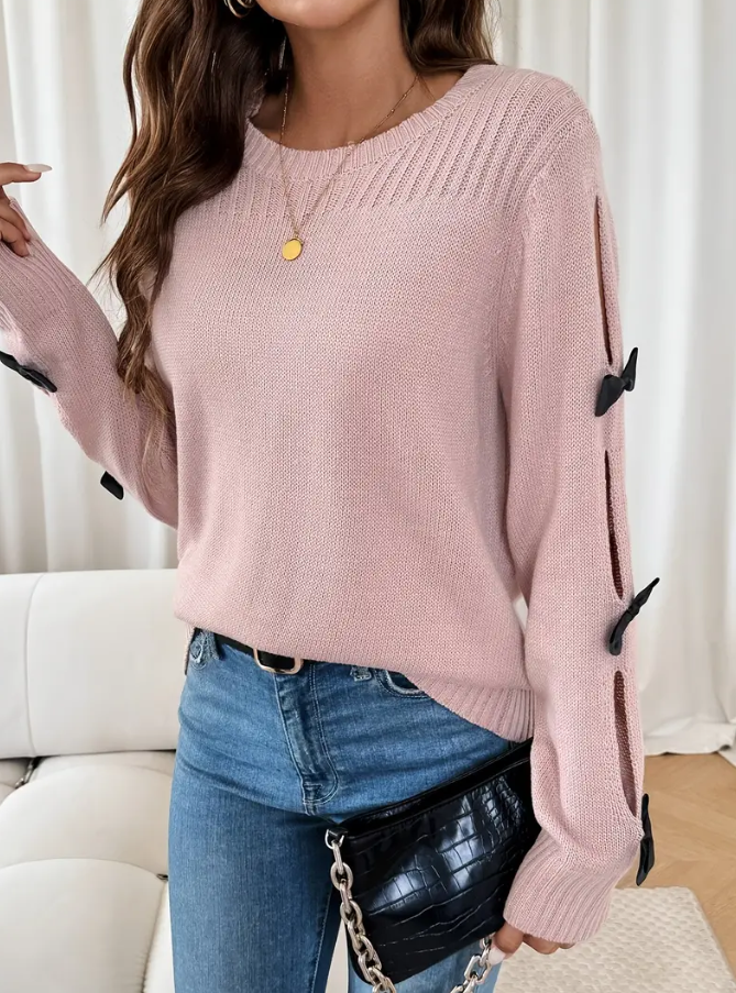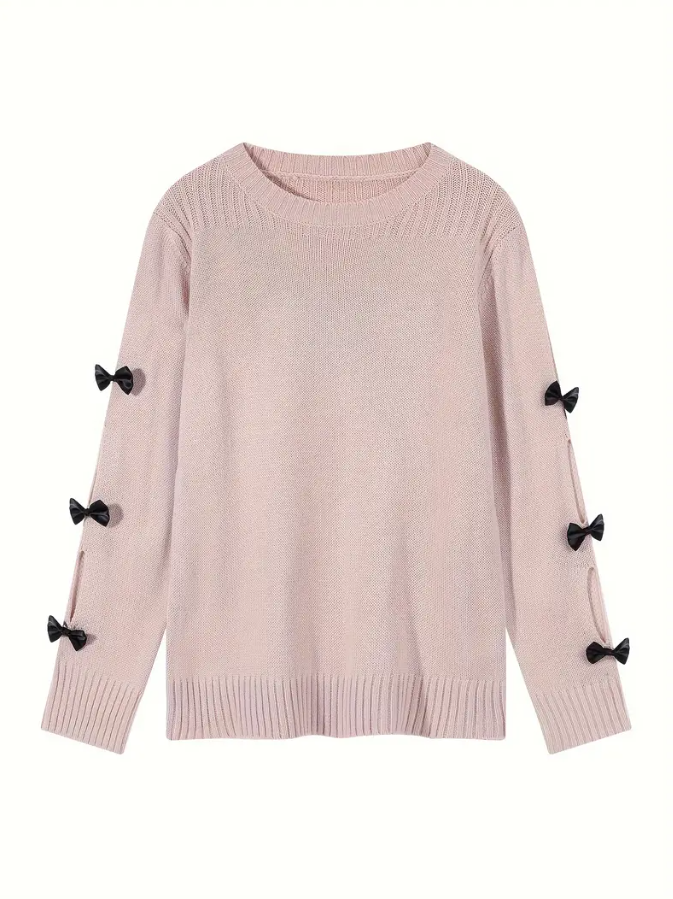 The Pale Pink Bow Detail Long Sleeve Sweater features a round neck, slight stretch, and cutouts with bow detailing along the sleeves. This sweater adds a fun and cute element to any outfit.